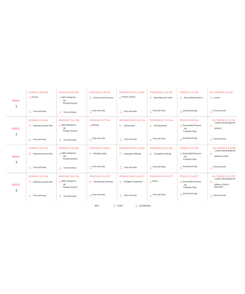 除了巴斯 ( Bath ) 豐富的歷史之外,這座美麗的城市還有很多值得遊覽和做的事情。四處走走,探索喬治亞風格的建築,或乘船遊覽埃文河 ( River Avon ),在雪梨花園 ( Sydney Gardens ) 踢足球,或在瘋狂高爾夫比賽中挑戰國際青少年球友。溫馨小鎮環境營造出安全、友善的氛圍,讓您在學習營文與玩樂的同時放鬆身心。