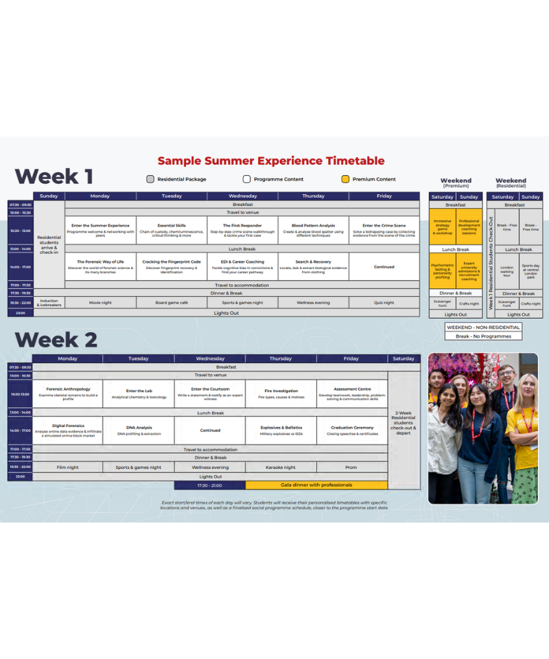 在為期兩週的課程中,學生將透過一系列沉浸式的職業模擬和獨家的專業現場訪問,體驗在倫敦工作的法醫科學家的經驗。在模擬犯罪現場取得證據,進行指紋和血跡分析,並在最先進的實驗室中提取 DNA。此外,學生能直接面對業界專家進行一對一的職涯建議輔導並獲得相關推薦信與證書。還能額外獲得UCAS積分,對於未來大學申請有莫大助益!
