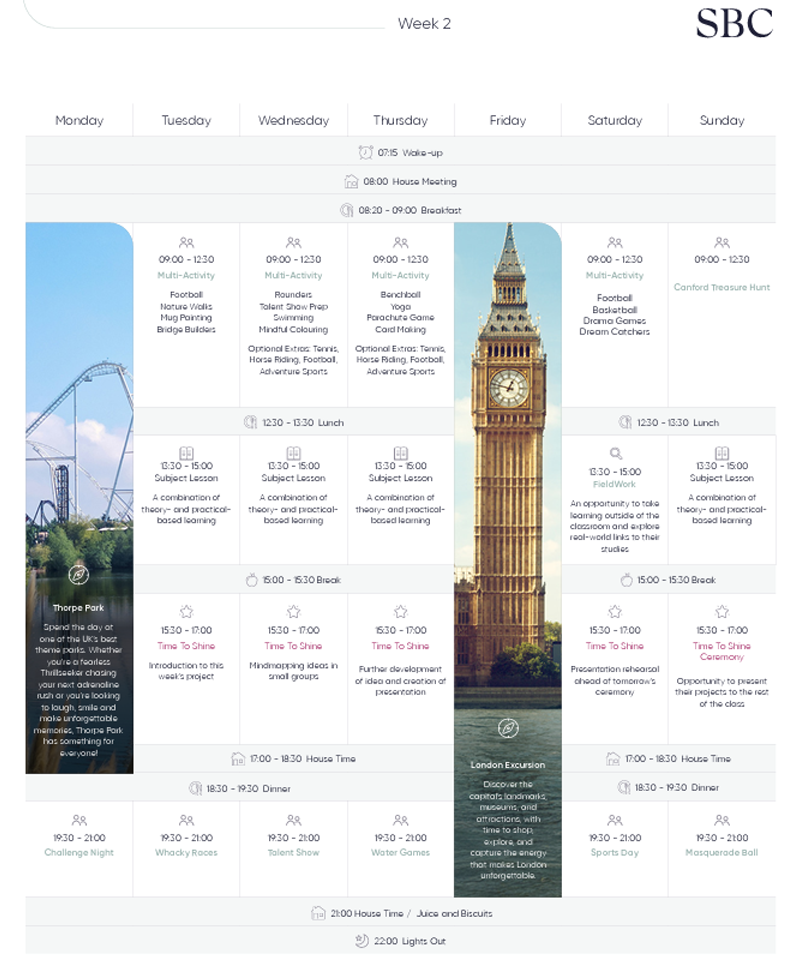 SBC位於坎福德(Canford)的暑期學校非常適合 11-15 歲的青少年學生,在屢獲佳評的開放式中沉浸式的體驗刺激與令人興奮的團康活動和學術科目。由經驗豐富的 SBC 團隊設計的 Canford 暑期學校確保學生能度過一個充滿樂趣且難忘夏天!