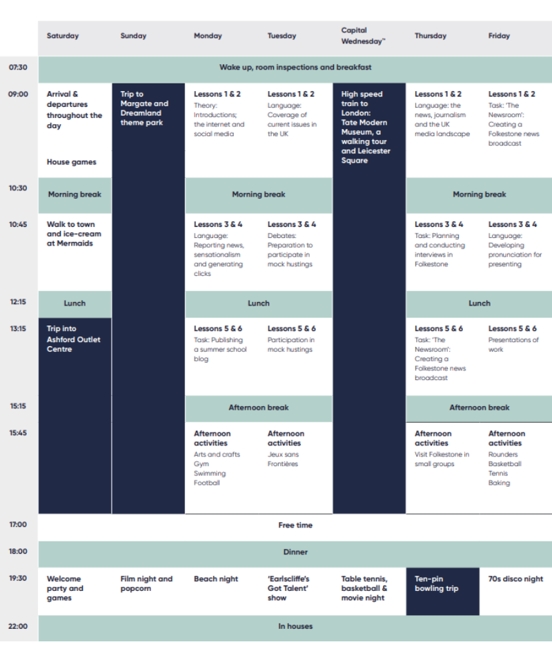 位於肯特郡的 Earlscliffe 暑期學校為 13-17 歲的學生提供豐富的學術體驗。將生動的教育課程與文化遊覽和有趣的體驗活動相結合,為學習者提供一個正向的成長環境。藉多元專業的專業暑期營發掘新技能並激發對學術科目的熱情。除此之外,學生還可以結交志同道合的朋友,留下美好的回憶,建立自信。
