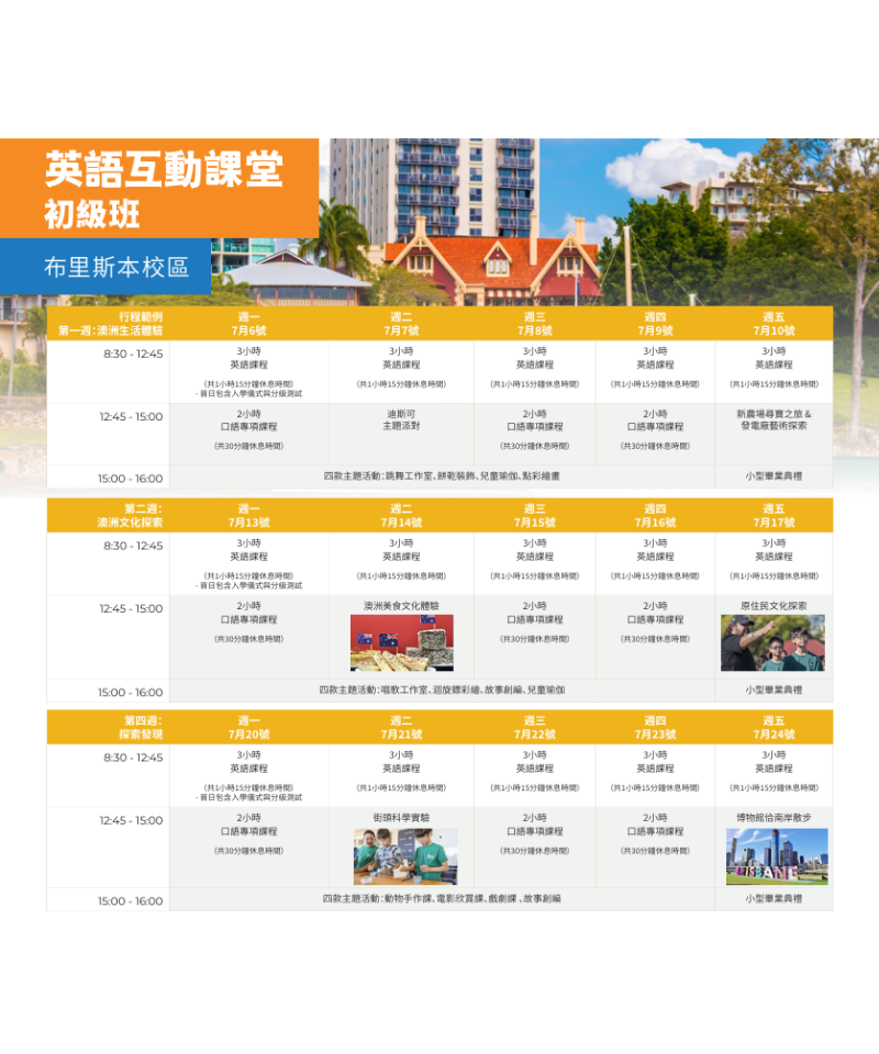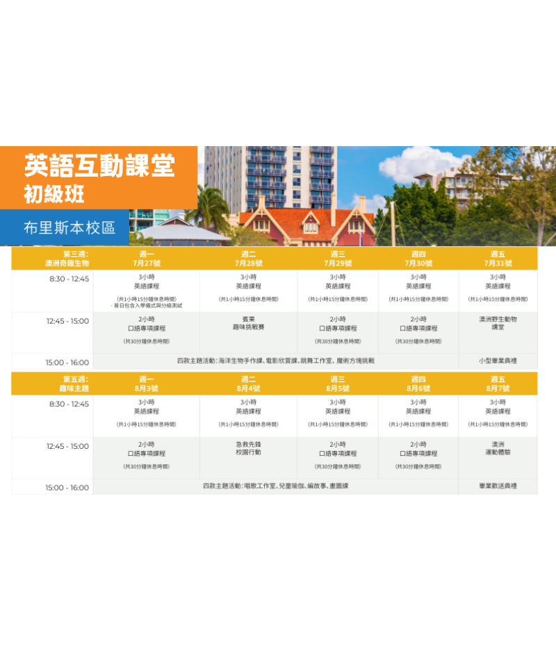 青少年學習營為您的孩子提供提升英語學習技能的機會,同時讓他們體驗澳大利亞的生活。學生將在週一至週五接受每天三到五小時的英語課程,並參與各種有趣的活動和文化遊覽。在這個安全、友善的環境中,您的孩子將在經驗豐富且資質優良的教師指導下,充分發揮他們的潛力。