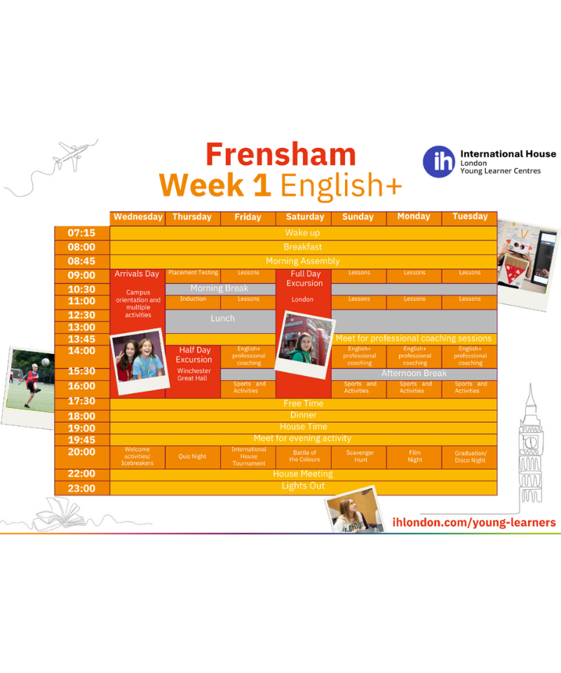 學生課後也可參加體育、藝術和手工藝以及其他活動,旨在透過樂趣和團隊合作來提升英語能力。學校也安排了晚間活動,包括時裝表演、迪斯可舞廳、電影之夜和尋寶活動。另外,學習旅行也是課程的重要部分,每週都有一次全天和一次半天的旅行,遊覽英國景點包括:伯明罕科學中心、瓦立克城堡、倫敦徒步旅行和倫敦眼、牛津和哈利波特工作室等。