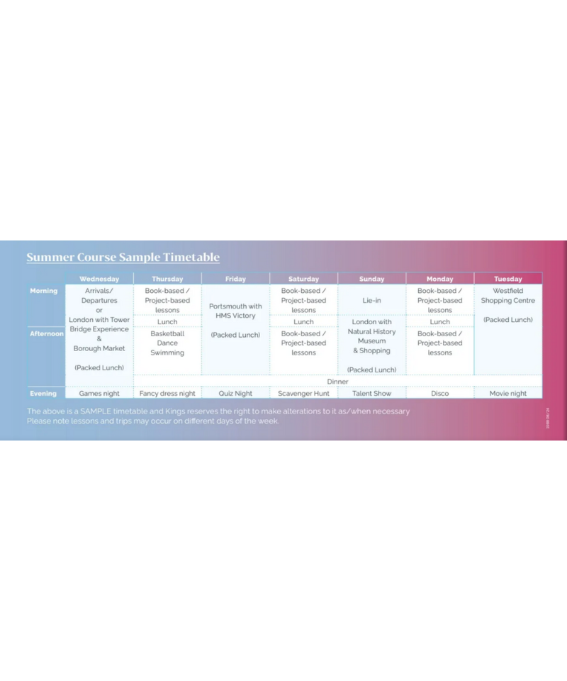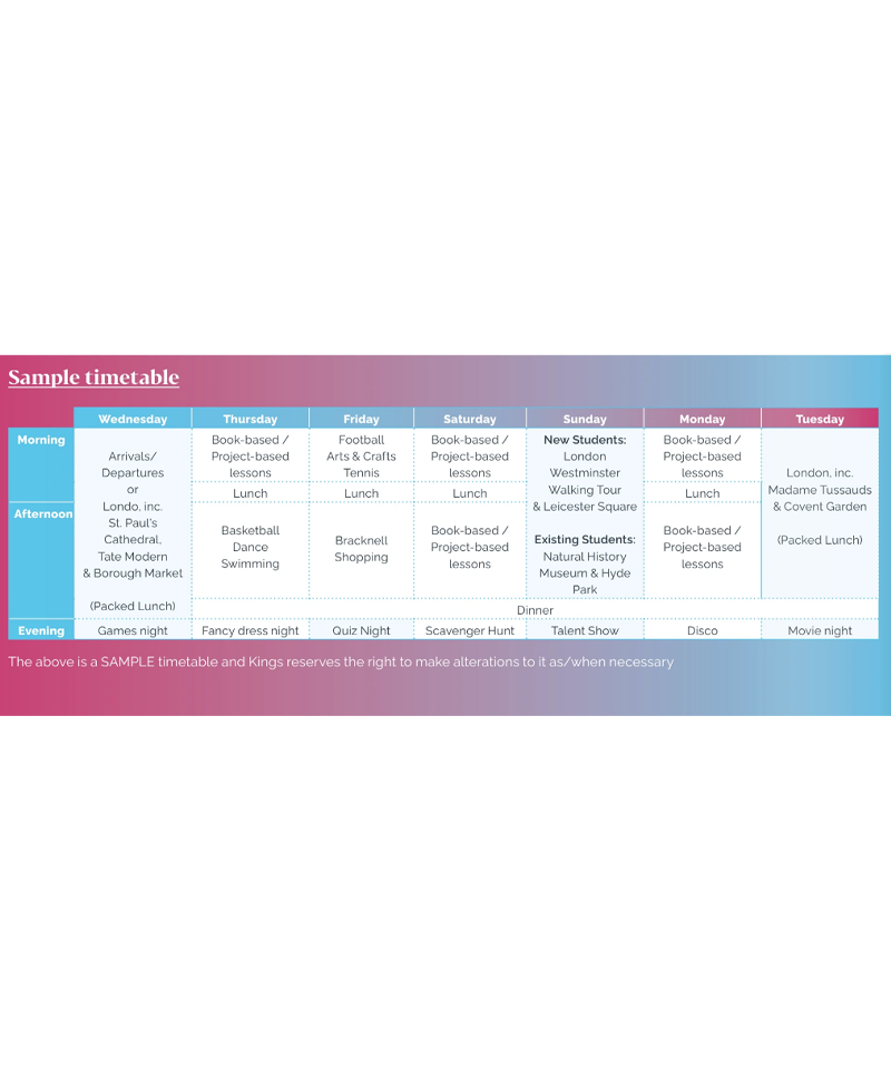 學生將在抵達時接受測試,並根據他們的年齡和英語能力被安排在適合的班級。學習是透過有趣的活動進行,包括專案、遊戲和小組工作,以提升團隊合作與溝通能力,進而增加自信心。