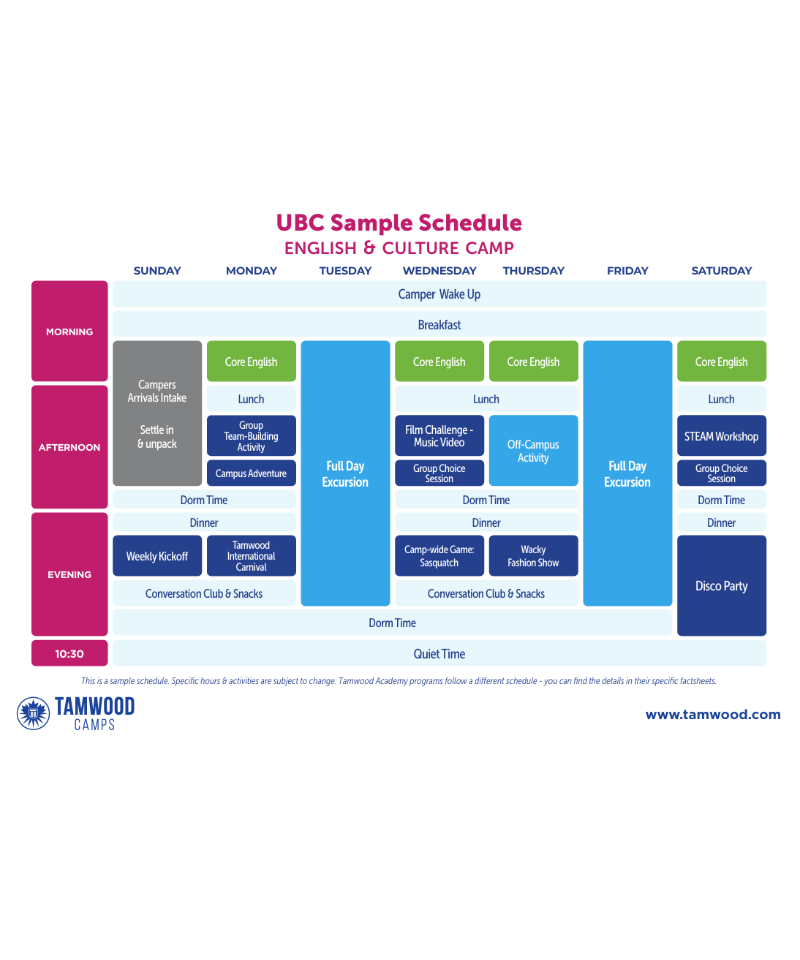 此夏令營舉辦在著名的UBC(英屬哥倫比亞大學),營地被綠意盎然的環境包圍,並享有太平洋的壯麗景色,營員們有機會參與各種活動,包括運動、藝術和教育課程。