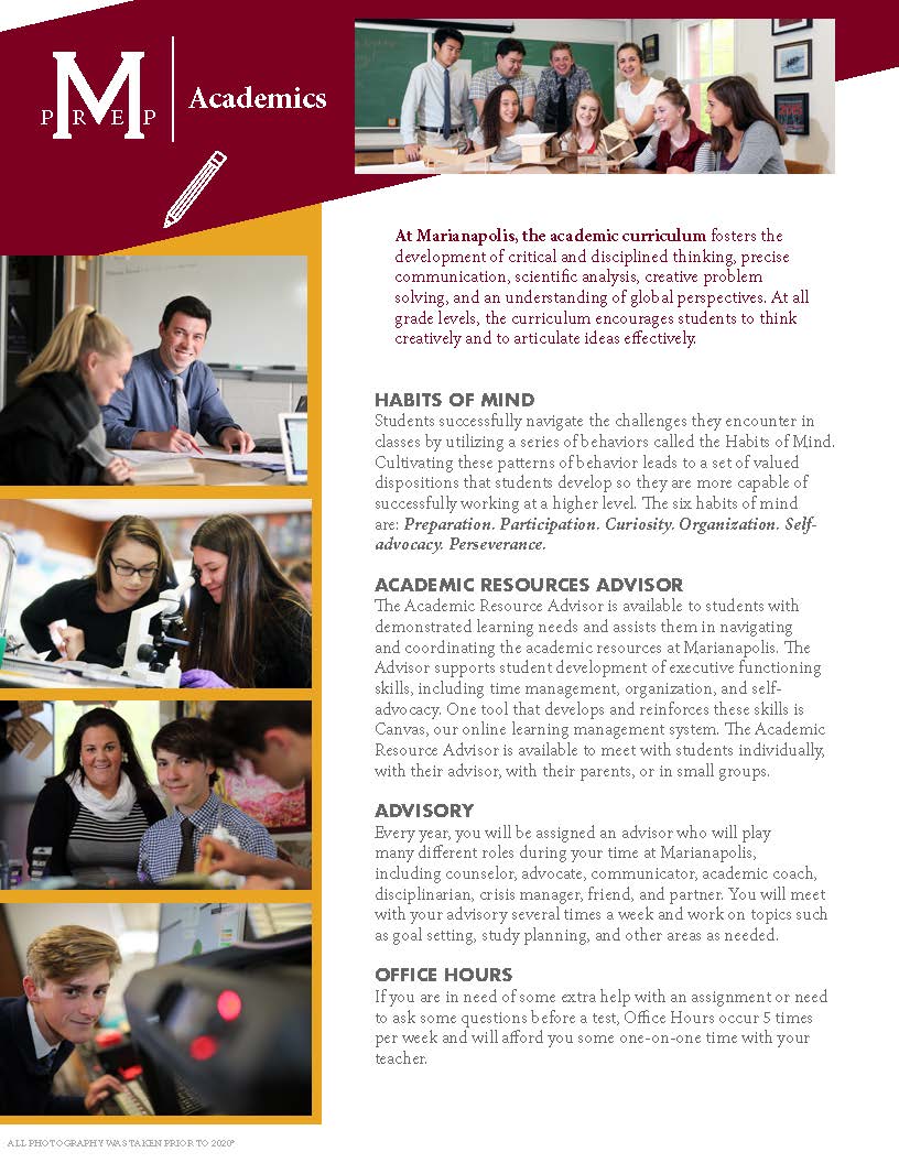 Marianapolis是一個充滿活力和活力的社區,由來自 56 個地區城鎮、美國多個州和全球 20 多個國家/地區的 400 名學生組成。擁有 7:1 的師生比例,平均班級規模為 12 人。通過各種榮譽課程、20 門 AP® 課程和 100 多門選修課,培養學生批判性思維,同時被引導成為成熟和有能力的領導者。學生們參與跨學科的活動,並不斷挑戰自己以設定新目標和打破常規。