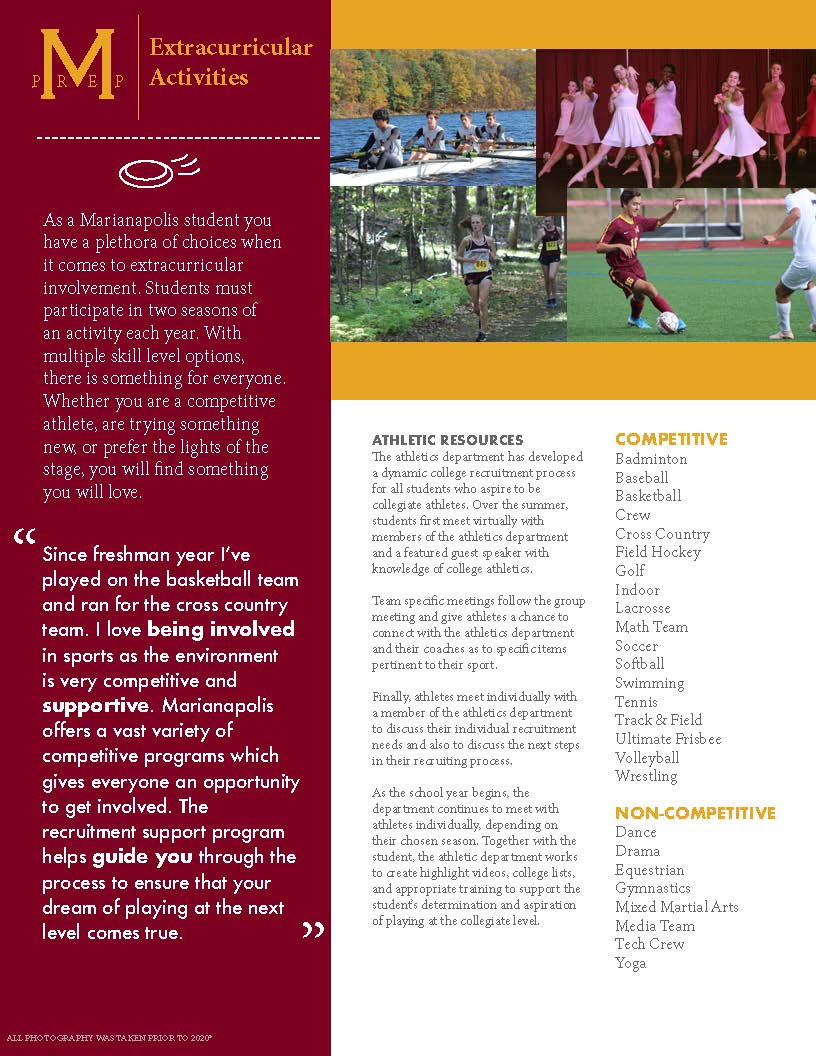 學生有 17 種競技運動可供選擇(如船員、游泳、曲棍球和籃球)以及眾多非競技選擇(如舞蹈、戲劇、馬術和體操)。擁有 40 多個俱樂部和組織,學生有能力探索和擴展他們的技能和興趣。學生將接觸到大量的領導機會,這些機會專注於支持Marianapolis社區,更具體地說,是支持學生團體。